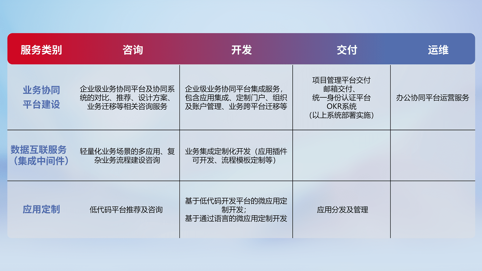 针对钉钉、、企微、、、IDaas等平台级产品提供产品的规划、、、方案、、、、交付、、、、定制化开发等服务,,实现如统一协同办公、、、智能客户服务、、、混合会议管理、、、智能数据查询、、、等业务场景,,,实现数字化转型。。。