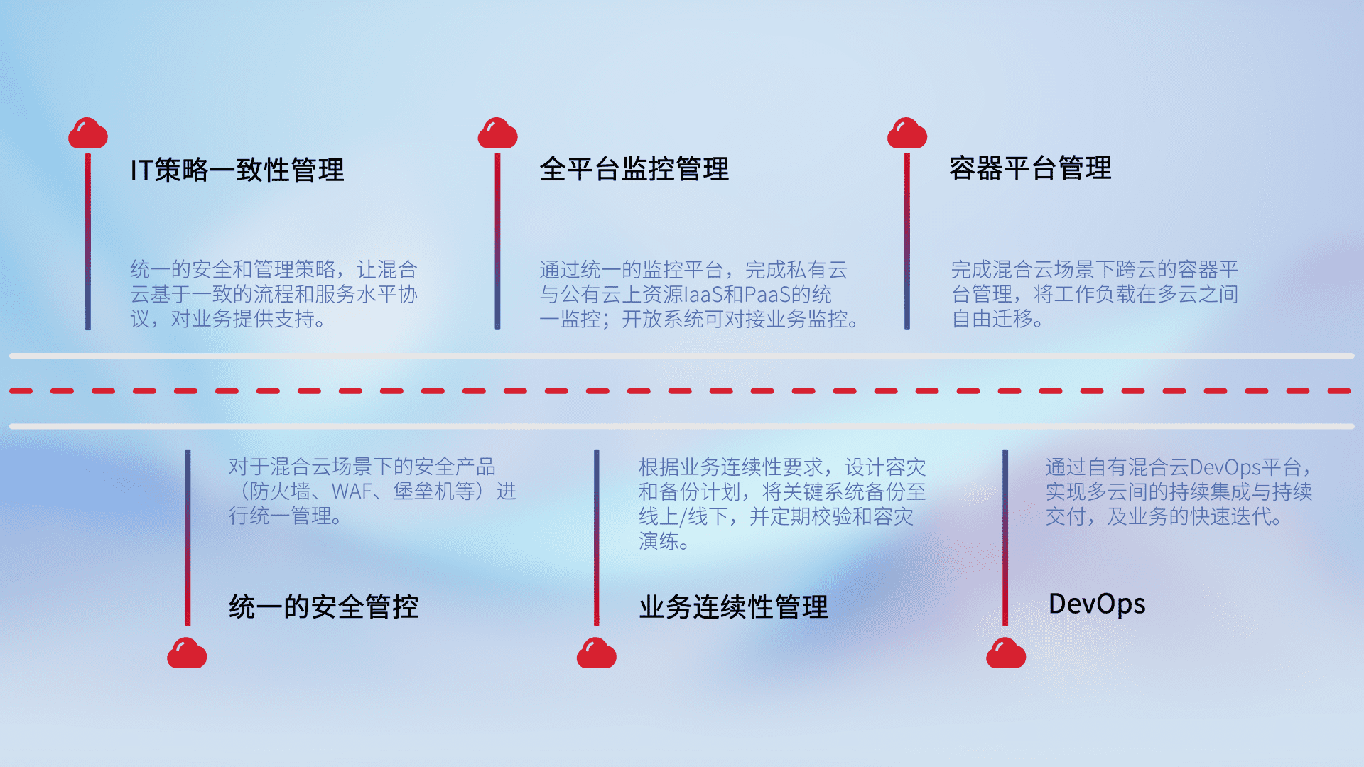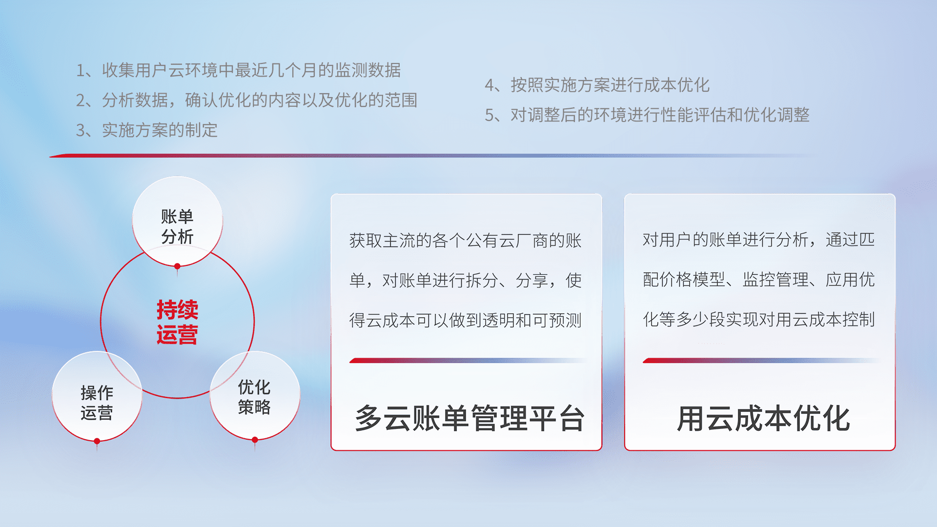 通过多云纳管,,,,以统一的资源数据模型把客户的云资源进行抽象和封装,,,进而实现对多云资源的统一操作,,,,保障云资源管理的可靠性、、、稳定性与可用性。。量身定制化运维内容,,,,配置、、、开发运维、、、补丁管理、、、备份、、监控、、、认证和访问管理、、、审计和日常巡检等,,,保障在用云过程中的可靠度,,,,稳定度以及高可用率。。。。